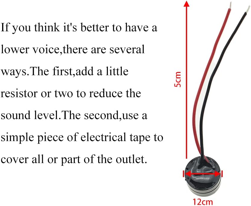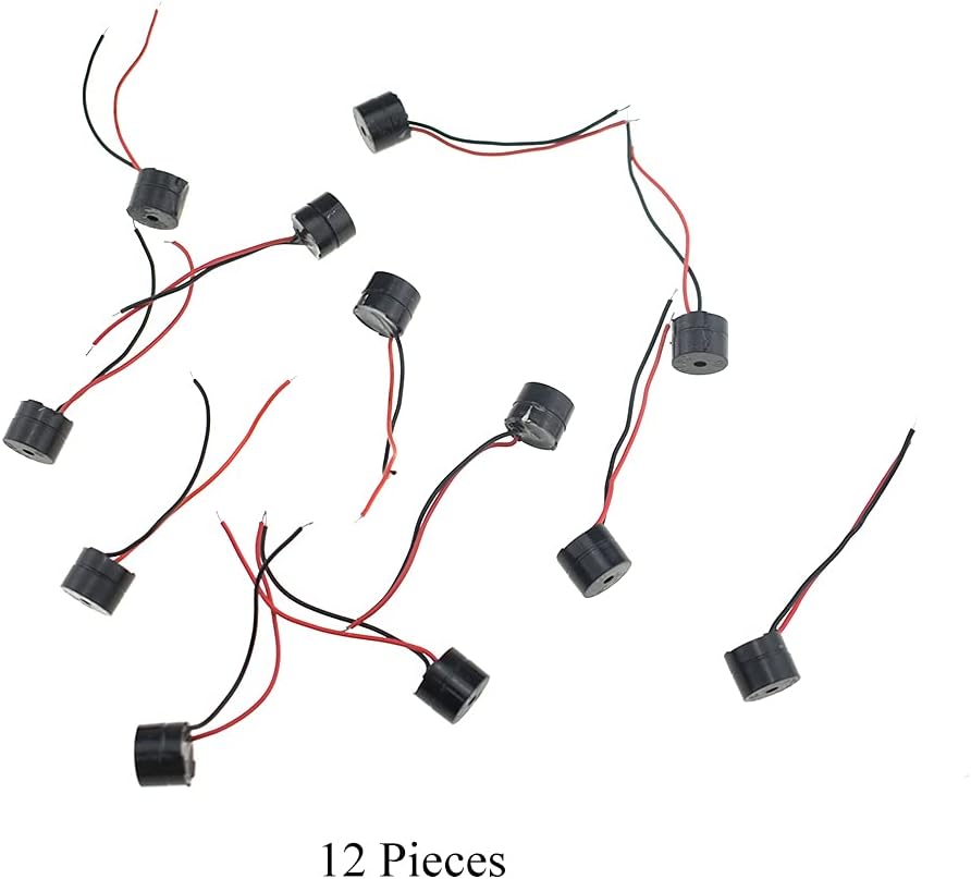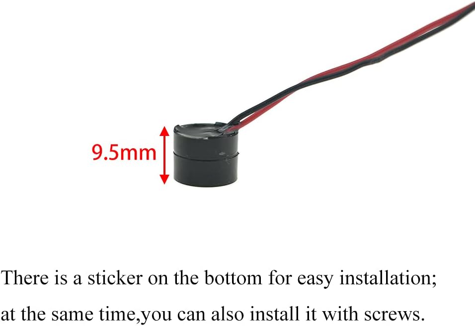 Material:Plastic Quantity:12pieces with 2 mounting holes for screw fixing Size:Body size:12×9.5mm/0.47″x 0.37″(D*H).Wire length:5cm/1.97″ The electronic buzzer will make a loud and continuous tone when powered.The sound above the engine can be heard from a few feet away.Widely used in computers,printers,copiers,alarms and other electronic products as sound devices.